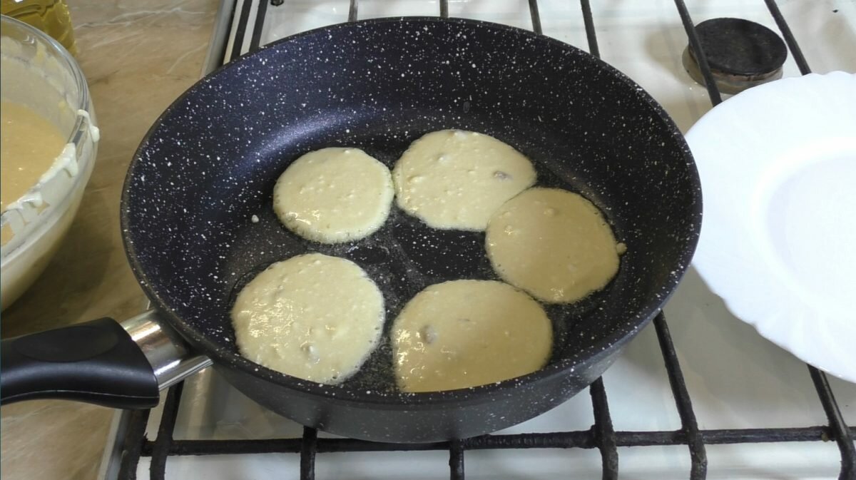 Нагреваем сковороду и жарим как обычные оладушки, с небольшим количеством растительного масла на среднем огне до золотистого цвета.
