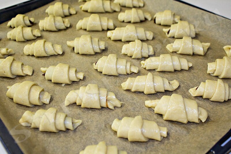 Выложить рогалики на противень застеленный бумагой для выпечки. Выпекаем в разогретой до 180 грудусов духовке примерно 20-25 минут. Из общего количества теста у меня получилось 32 рогалика.