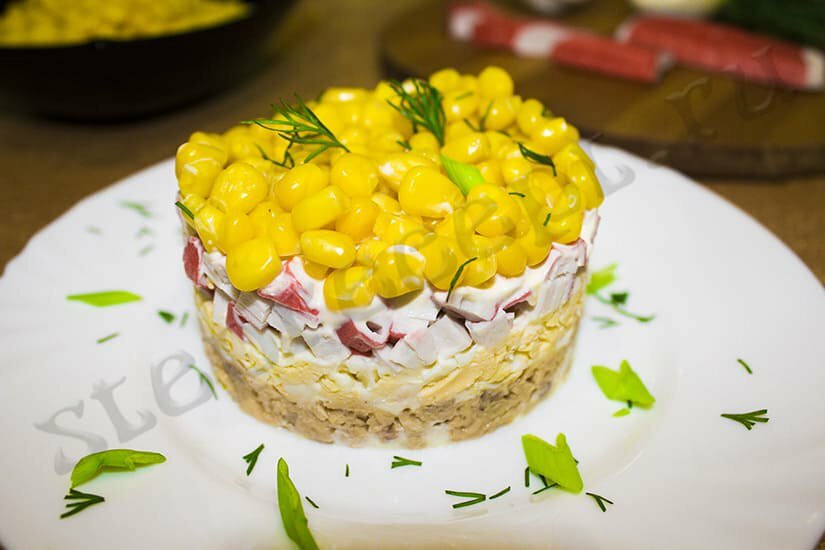 С кукурузы сольем сок. Выкладываем верхним слоем, украшая в виде "шапочки". Такой салат отлично подойдет для любителей рыбных блюд с сочетанием сладковатой кукурузой. Приятного вам аппетита!