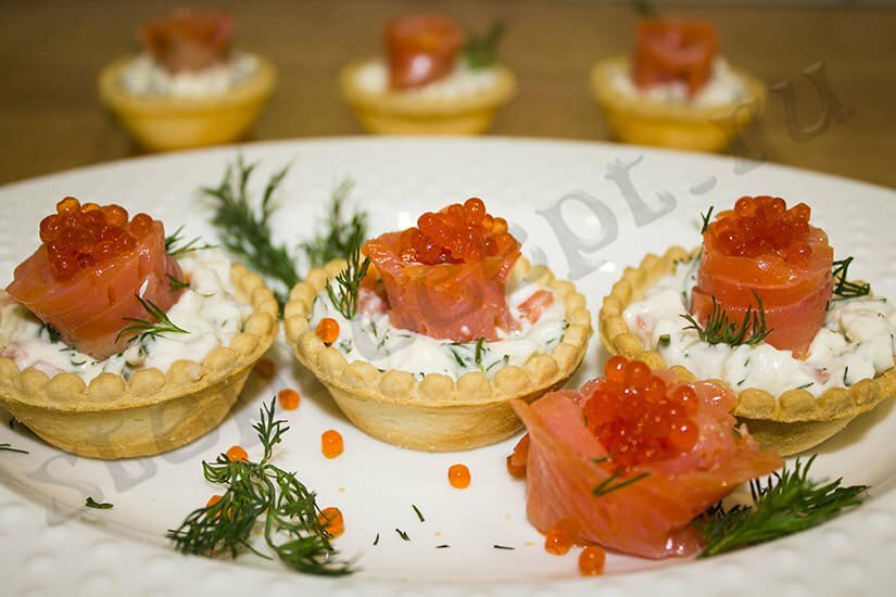 В серединку цветочка по желанию можно положить немного красной икры. Закуска из тарталеток с красной рыбой, готова. Приятного аппетита!